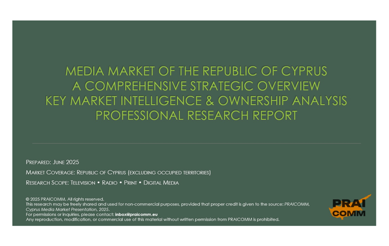 Prepared by PRAICOMM, this presentation is intended for policymakers, media professionals, investors, and civil society actors. It highlights key risks, structural dynamics, and strategic opportunities in Cyprus’s evolving media ecosystem — with a strong focus on transparency, sustainability, and democratic accountability.